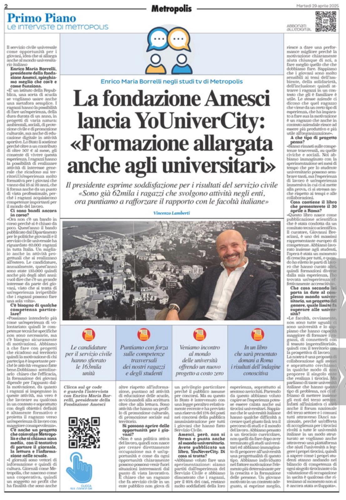 La Fondazione Amesci, nell’ambito del progetto YoUniverCity, sotto la supervisione di un Comitato Tecnico Scientifico costituito da istituzioni quali Inapp, Sviluppo Lavoro Italia e l’Università Federico II di Napoli, ha realizzato uno studio sull’impatto di esperienze di apprendimento non formale, come il servizio civile, sulle competenze e l’occupabilità dei giovani, raccontato nel libro edito da FrancoAngeli “Giovani, competenze trasversali, occupabilità. Costruire esperienze, tirocini e transizioni di qualità̀”, a cura dal Professor Pier Giovanni Bresciani, con la presentazione del presidente Enrico Maria Borrelli.